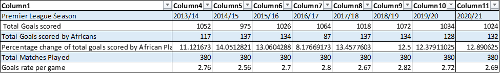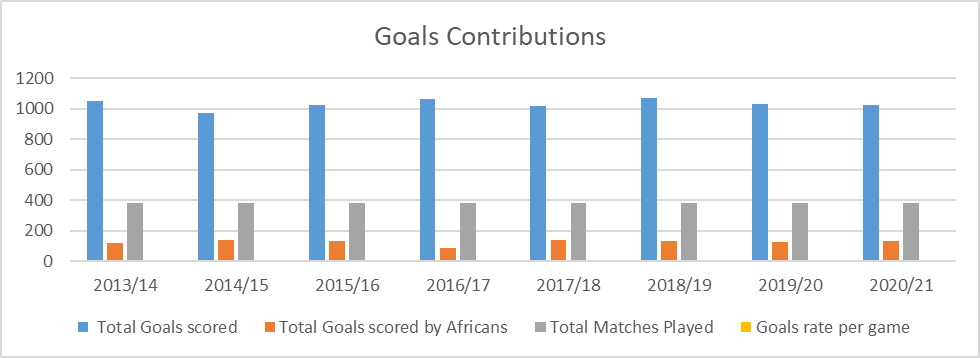 The study utilizes data from seasons 2013/14 till 2020/21. Across these seasons, it is observed that African players had the most goal contributions in the 2014/15 season with 137 goals out of 975 total goals scored throughout that season. This is at a percentage rate of 14%, compared to 11% of the previous season.